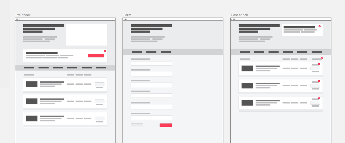 Before we began building, I created a series of low fidelity mockups to help the team understand the flows and data requirements at each step. This started with some basic blocking out of sections so everyone understood how the flow moved from the initial view, through the form to the results.