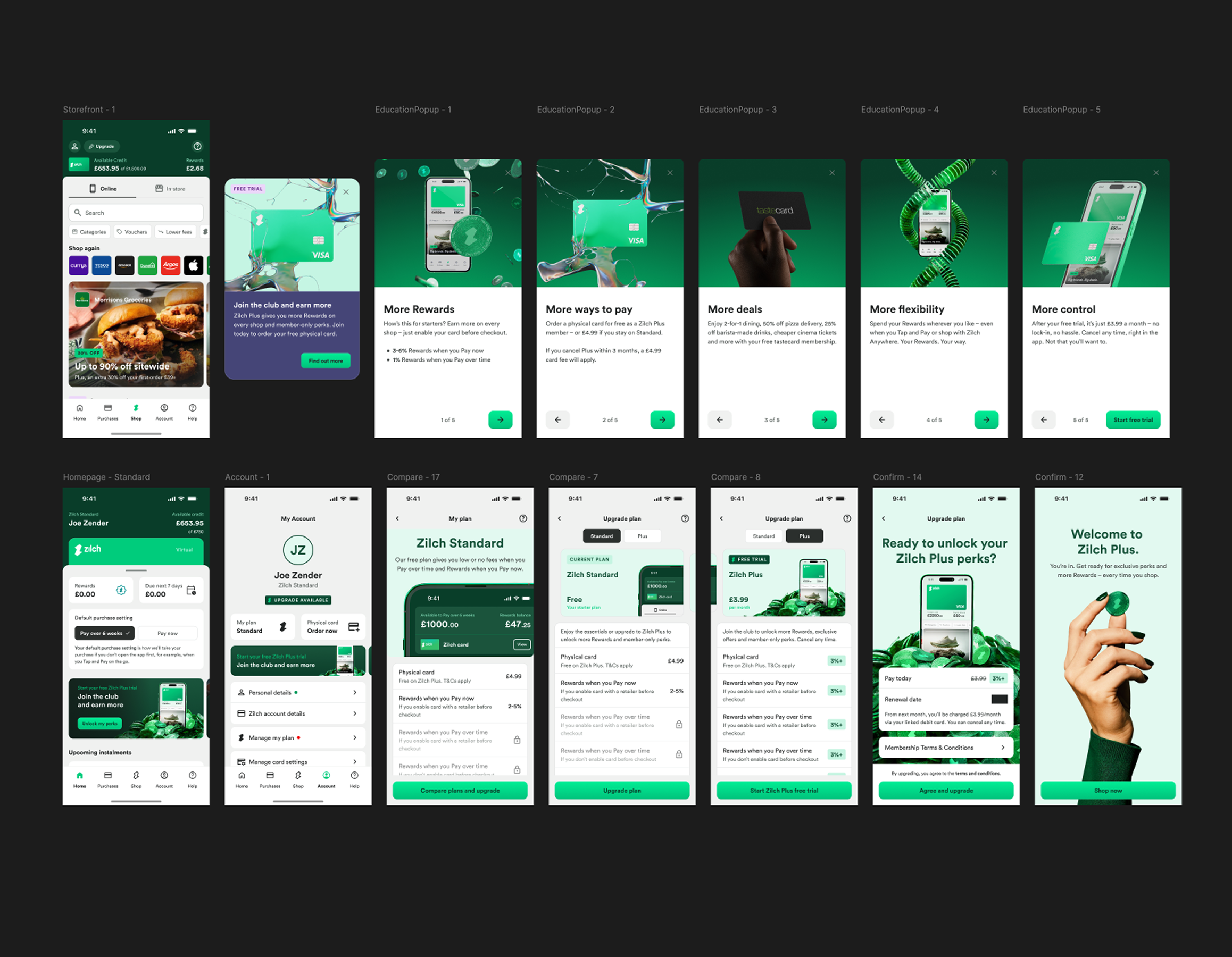 In parallel to the discovery research I was carrying out to validate Zilch Plus, I began working through the screens, flows and touchpoints we needed for launch. I generated a rough set of screens to enable early alignment with product and engineering about what the scope of the project would be.